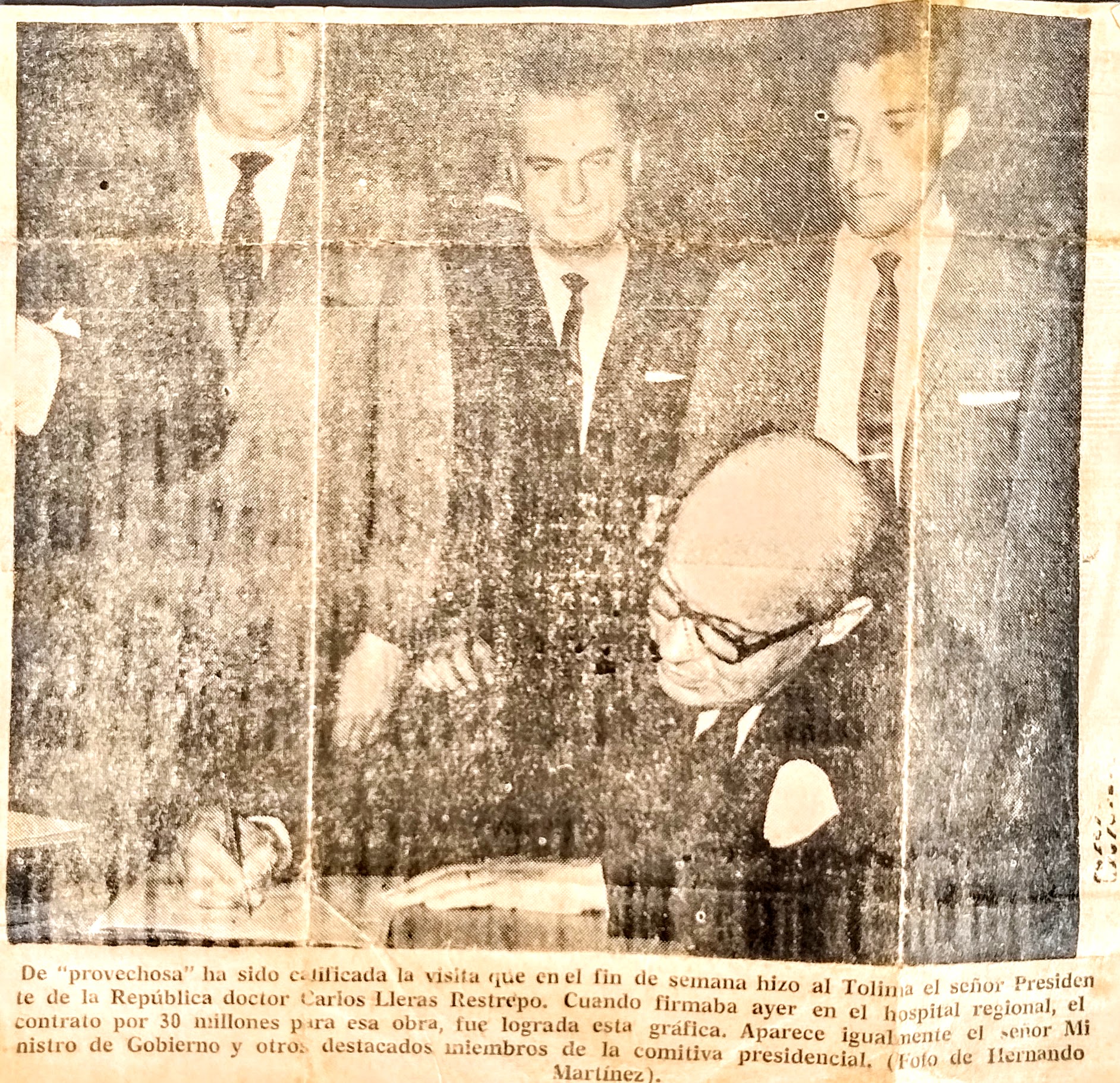El Dr. Carlos Lleras Restrepo recorrió las instalaciones hospitalarias, cuya construcción estaba bastante adelantada; llegó con funcionarios del Ministerio de Salud y con personal técnico del Fondo Nacional Hospitalario, entidad encargada de la revisión y aprobación de diseños hospitalarios y centros de salud y de la importación y distribución de elementos para dotación de hospitales; el señor Presidente y su comitiva expresaron su satisfacción por el estado y presentación de la obra; el Dr. Lleras Restrepo, en una corta charla, manifestó que para él era más fácil conseguir dinero para construir 20 hospitales como éste, pero difícil conseguirlo para el funcionamiento permanente y eficiente de uno solo como éste.